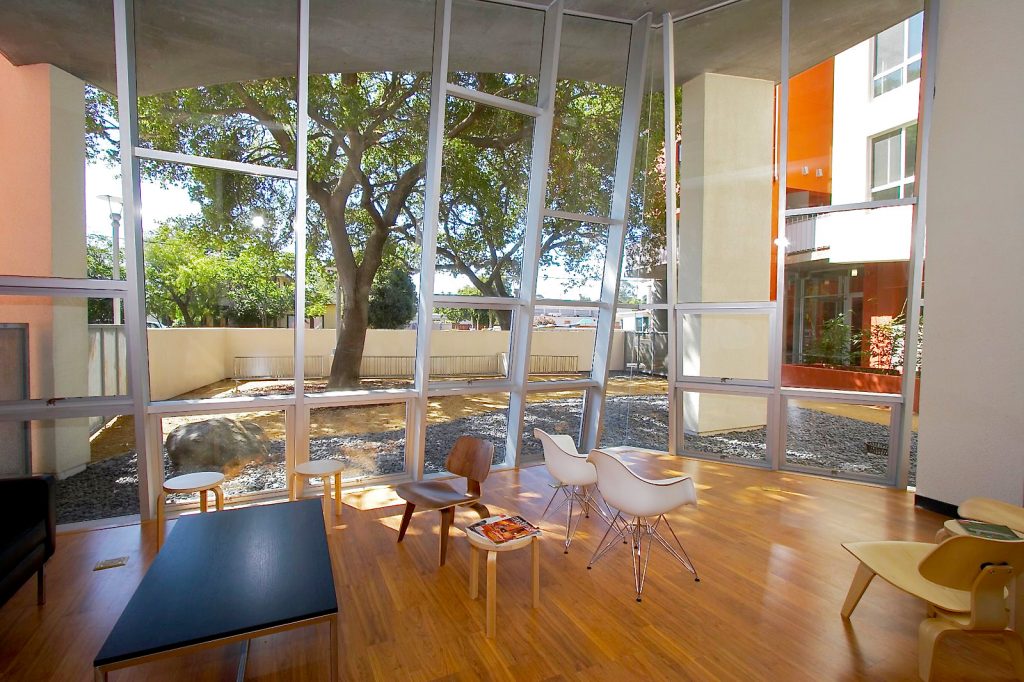 A commitment to energy conservation and sustainable design guided the design process. Natural daylighting and ventilation bring light and fresh air into the service center, common areas, hallways, and residential units. Rooftop photovoltaic panels provide electricity for the common spaces. Sustainable materials were specified for the finishes and furnishings.