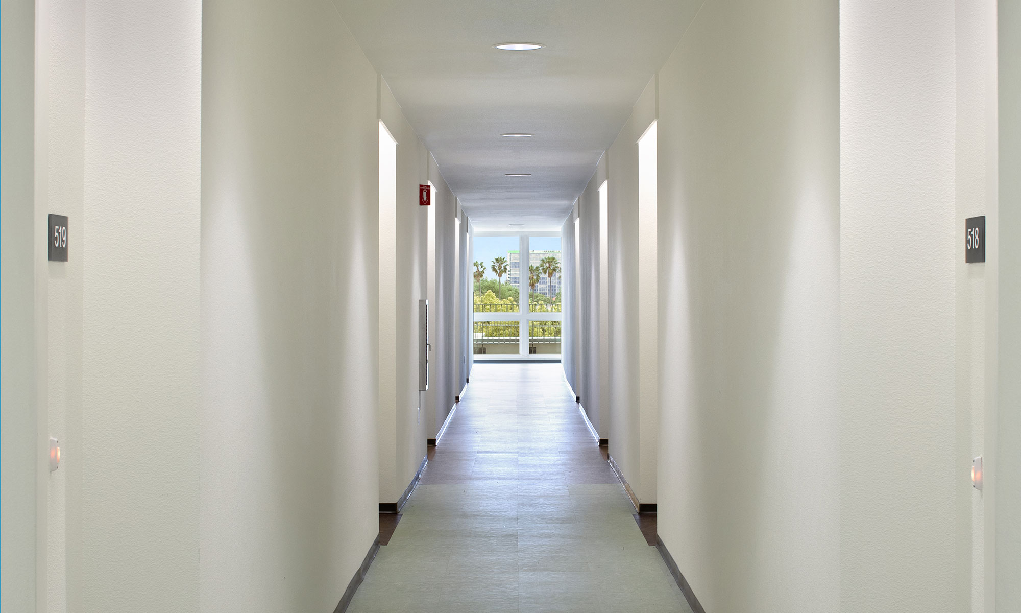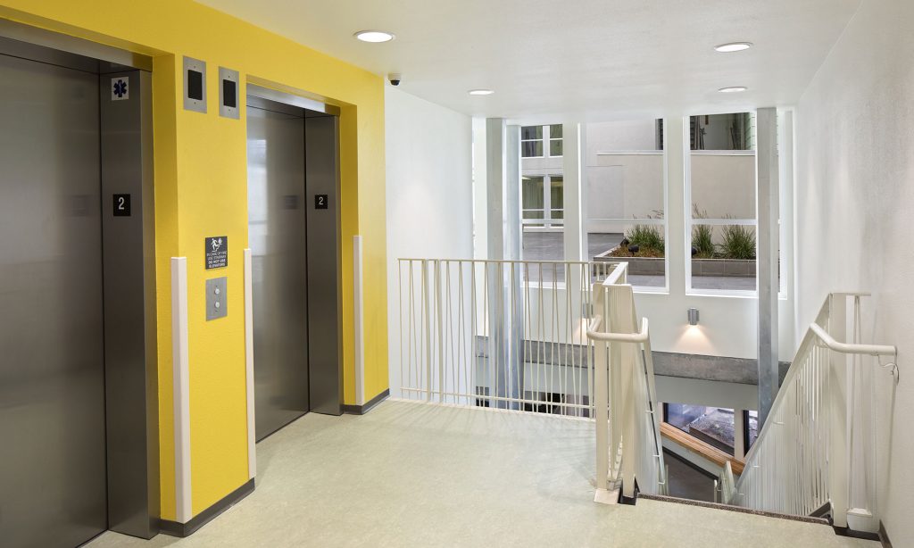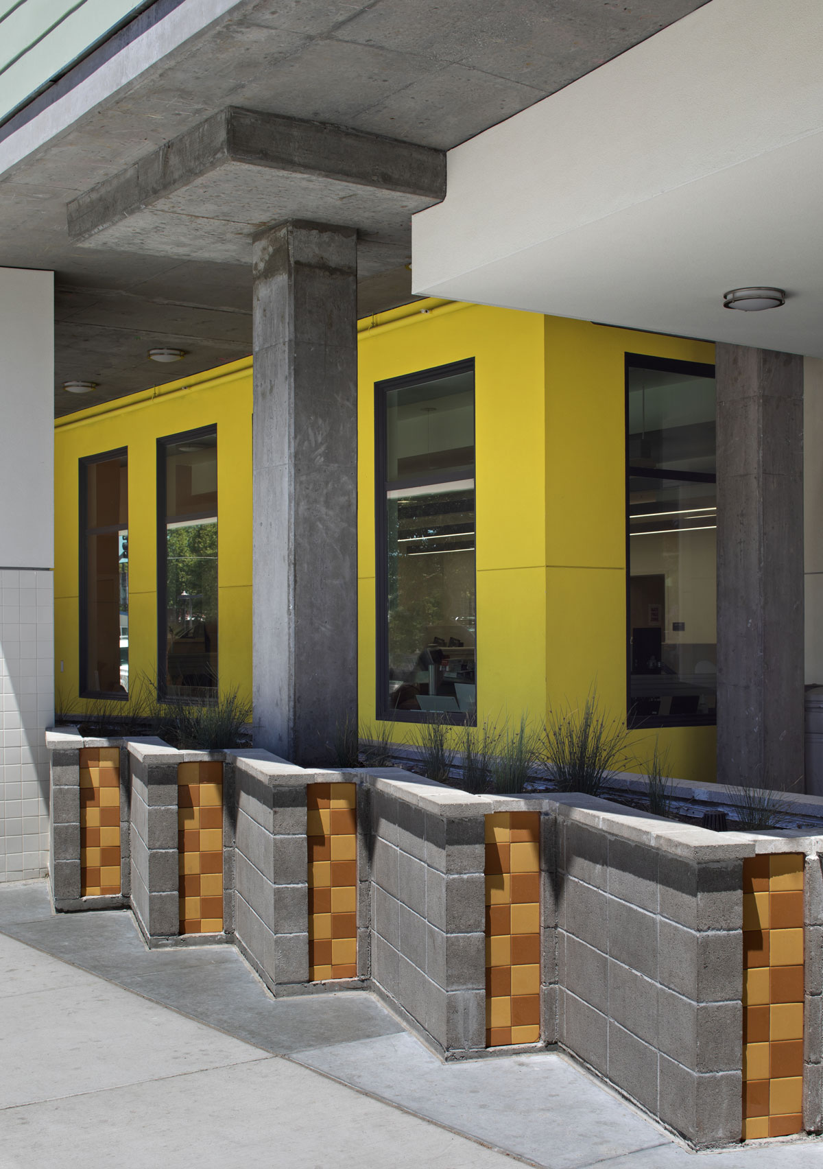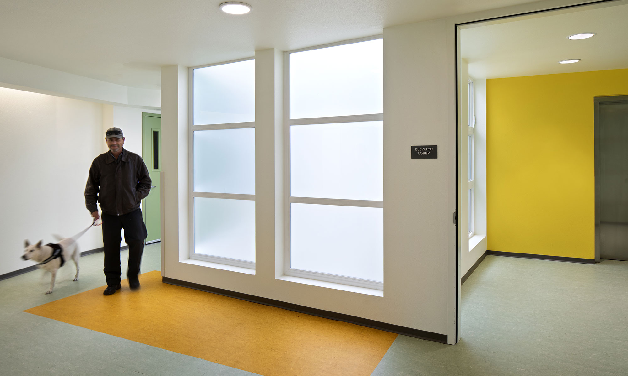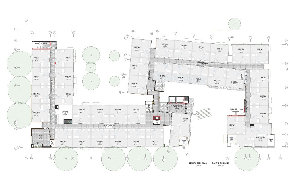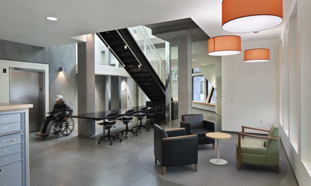 The project consists of a mix of studio apartments and one-bedroom units, with a two-bedroom manager’s unit. Building amenities include a residential terrace and covered porch, community room, kitchen, gym with workout equipment, computer lab, multiple lounges and group activity rooms, a landscaped rooftop courtyard and gardens on the ground floor. The ground floor includes commercial spaces for lease, as well as social service agencies to serve the residents and local community.