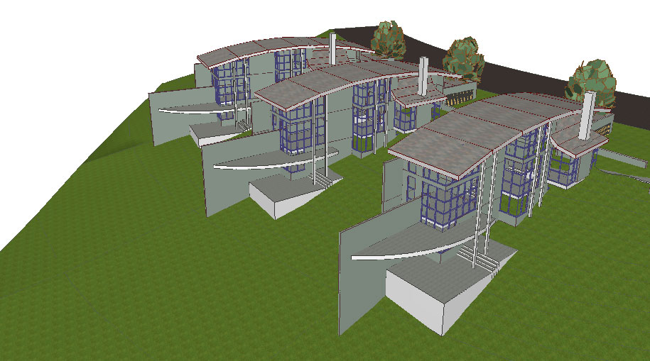 Three uphill houses have now been completed. The three-bedroom family-oriented houses stand four stories tall and include a domestic elevator. Although facades and fenestration vary, all three houses have the same floor plan. Each house also has a granny flat with its own garage suitable for a family member or work studio. The flat is accessible from a common street-level entry courtyard.