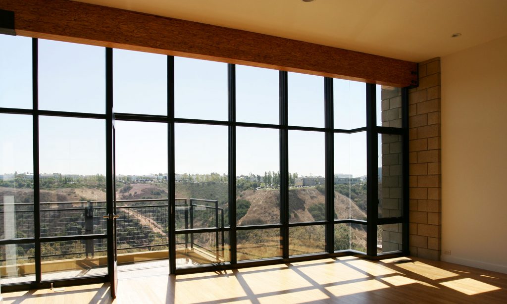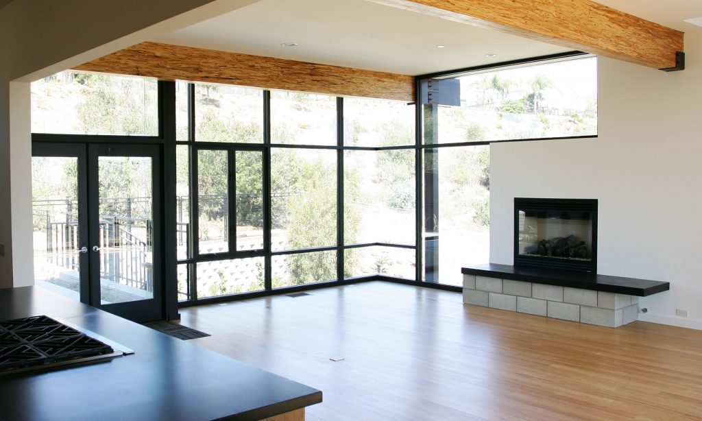 The first production house was built twice on the downhill side as part of the "tree filter" component of the plan. Simple and flexible in floor plan, a vaulted roof bonds the main space with the canyon below. Glazing is biased to the south sun and view. Moveable shoji screens and optional bookcase walls make a variety of living arrangements possible.