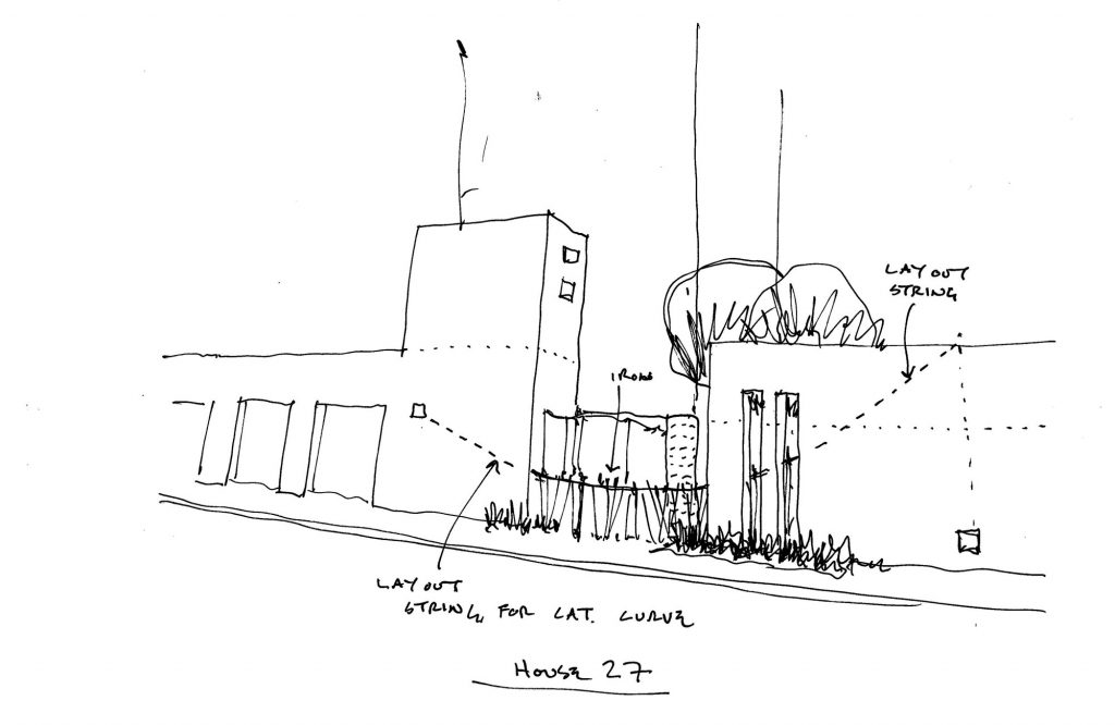 Shaw Lopez Park is given shape and character by creating a tight linear "wall" of houses on the uphill side of the street. This uphill urban edge is contrasted by the more porous rural downhill side of the street adjacent to the canyon. A soft, rolled asphalt curb replaces the sidewalk. Houses are made as narrow as possible to let the rustic canyon landscape reach uninterrupted to the central roadway. Special CC & R's prohibit domestic activities and water intensive plantings in the areas between the houses. Fencing on the property lines is not allowed so that the houses exist in a more natural setting.
