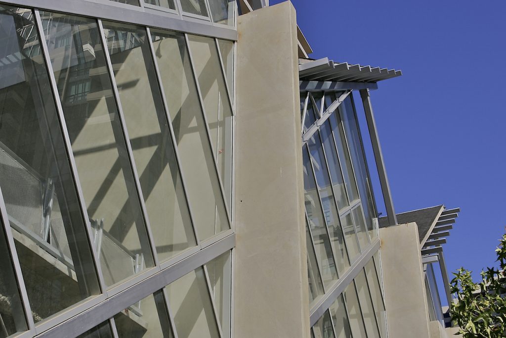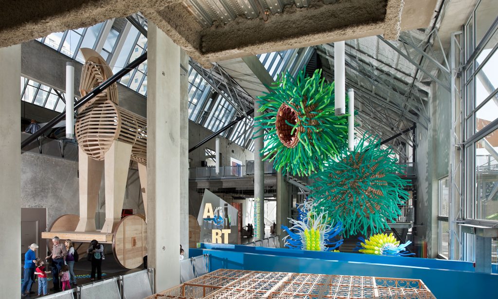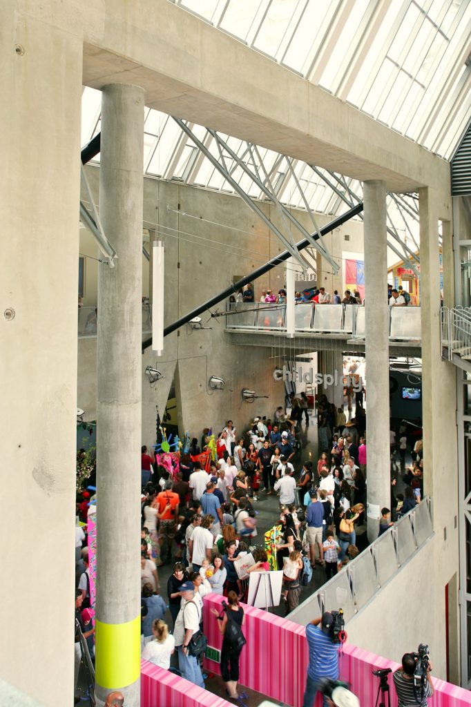 The spaces are neutral, flexible and fluid to allow for spontaneous events and changing art yet the building has a strong architectural personality. The architecture both illustrates the physics of gravity and earthquake and tells the story of its own construction with exposed connections and materials.