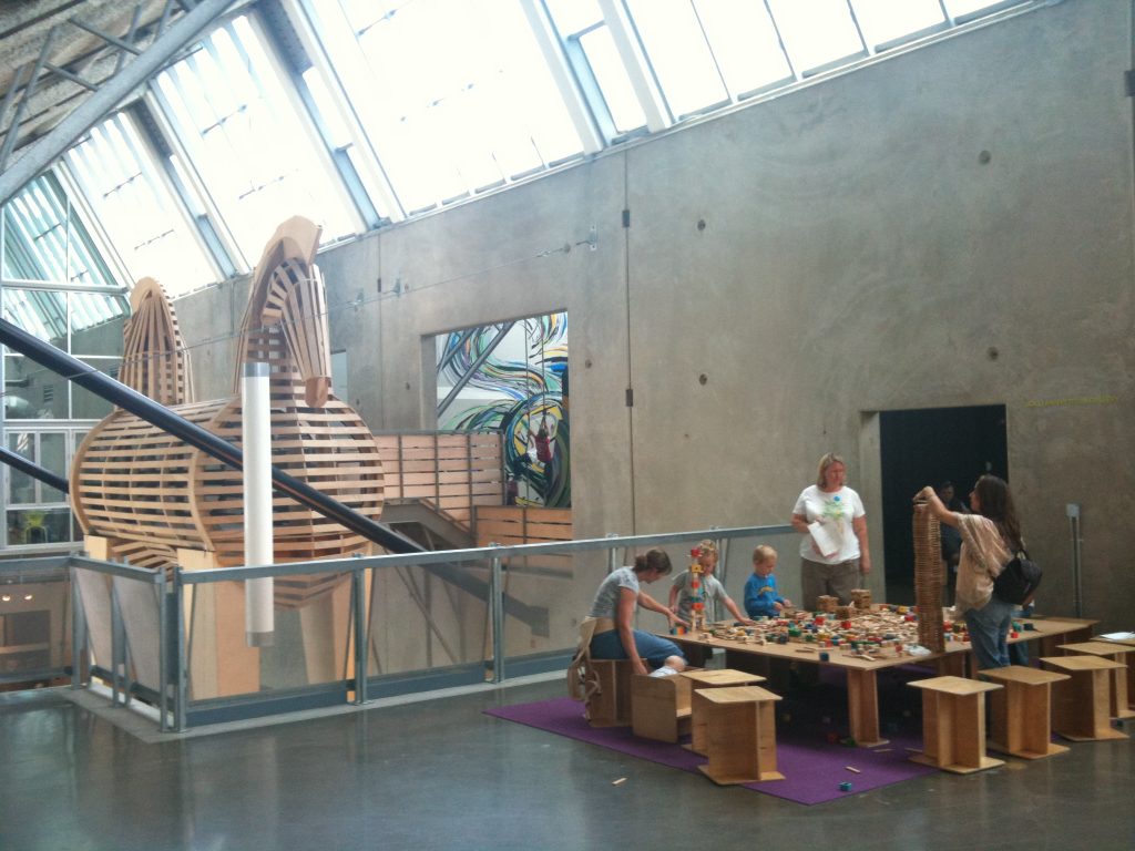 While the architecture has a lively interaction with the surrounding city and adjacent park, the interior is more subdued and neutral. More the “picture frame” than the picture itself, the building encourages energetic and uninhibited contributions from busloads of young Picassos.
