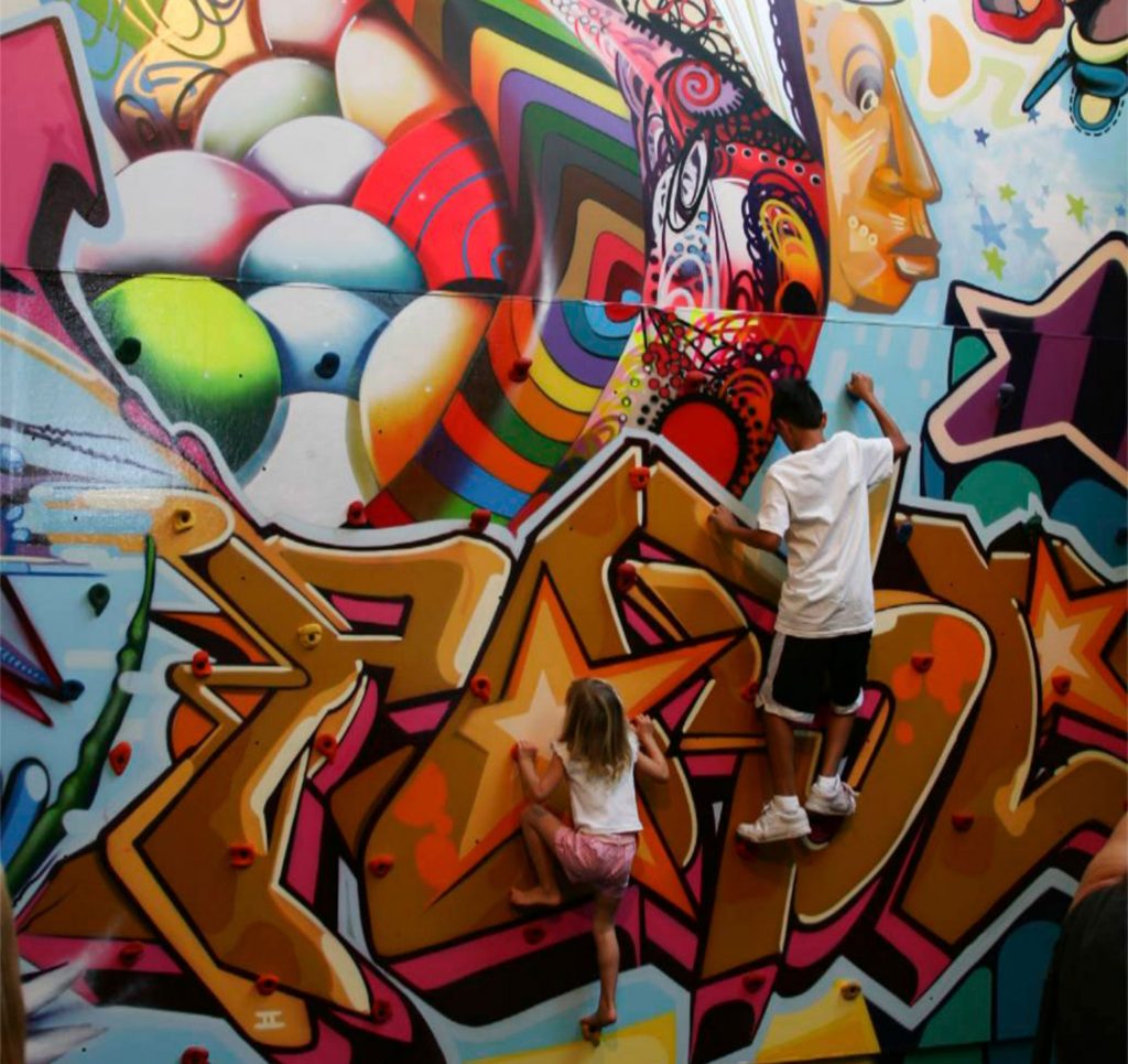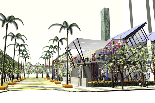 A vibrant and interactive children's park by landscape architects Spurlock/Poirier complements the building . The museum and adjacent park provide a civic anchor for Island Avenue – perhaps the area's most important east/west pedestrian street. A large second-level balcony overhangs the city sidewalk and engages the street and park.