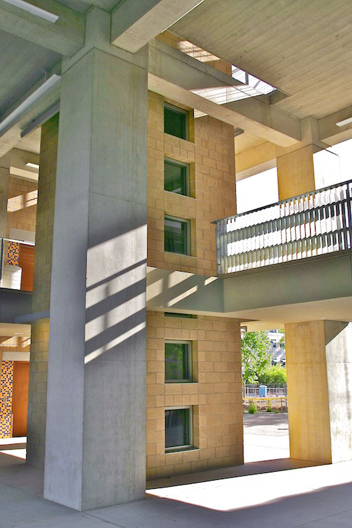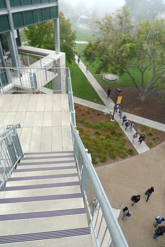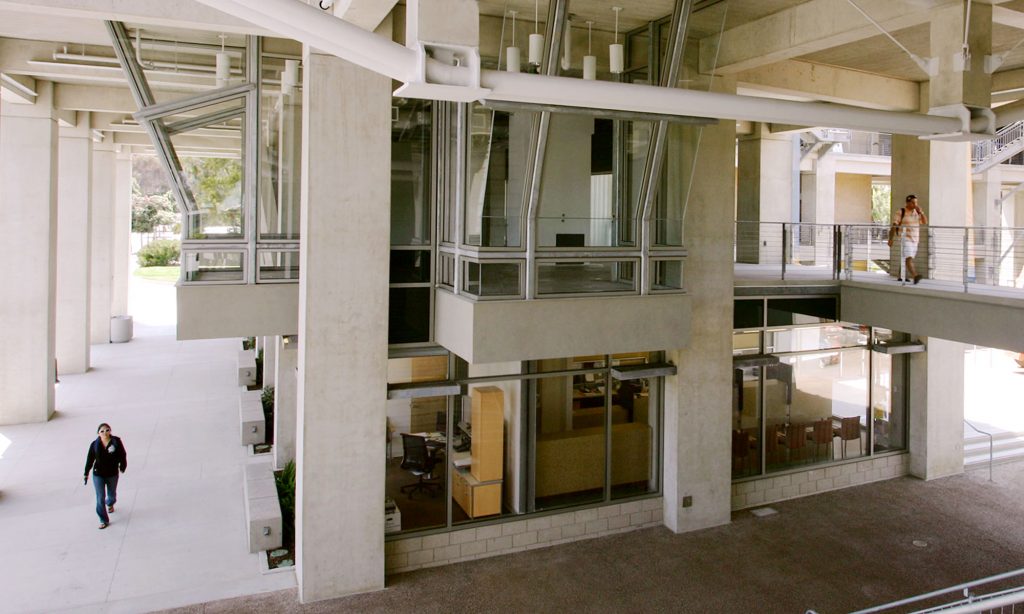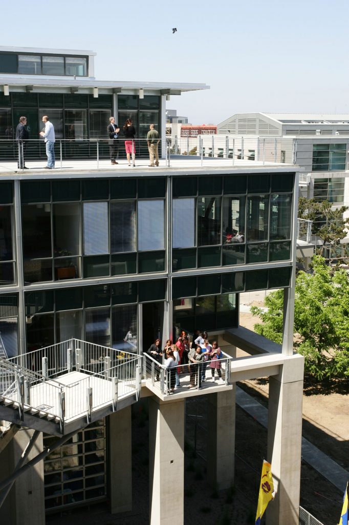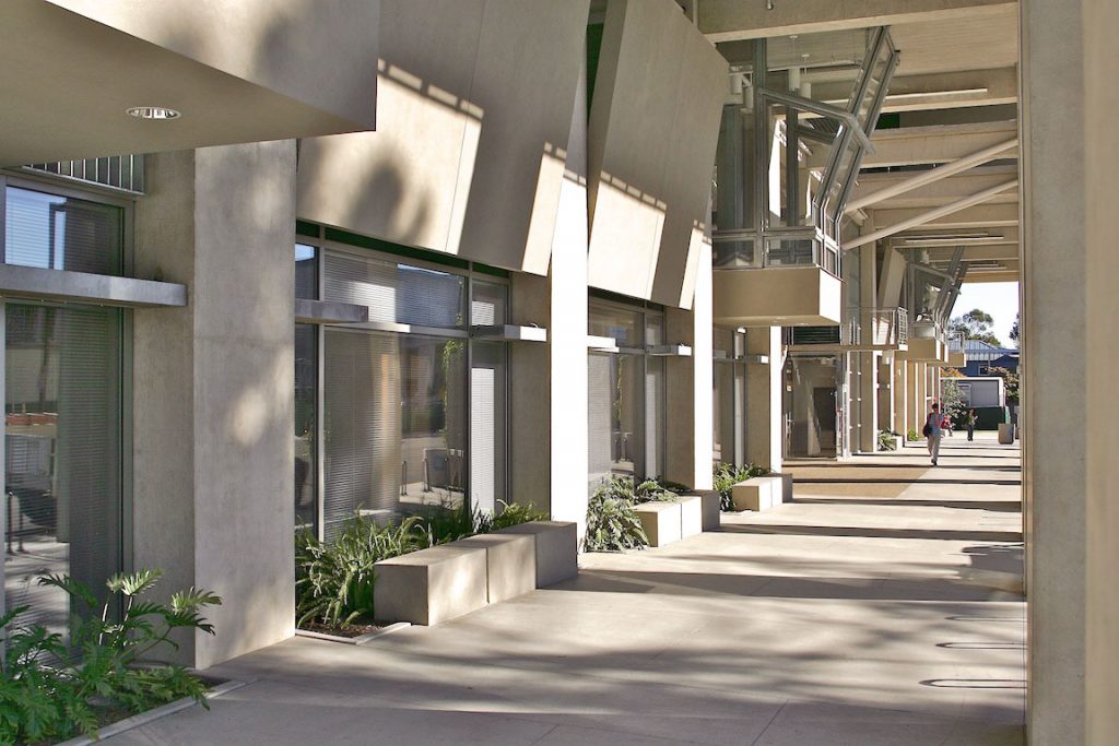 In the crook of the “elbow” where the two wings of the building join, a courtyard serves as a great outdoor lobby. Outdoor walkways on the upper floors link the major departments and include widened areas for spontaneous gathering and conversation, facilitated by the installation of outdoor furniture. Terraces, stairs, and landings overlook the courtyard and invite users to the upper levels. Retail spaces and restaurants further animate the structure. Occupying the ground-level corner of the “L” is the Triton Center where students and visitors receive information, guided tours, and referrals to the various departments in the building.