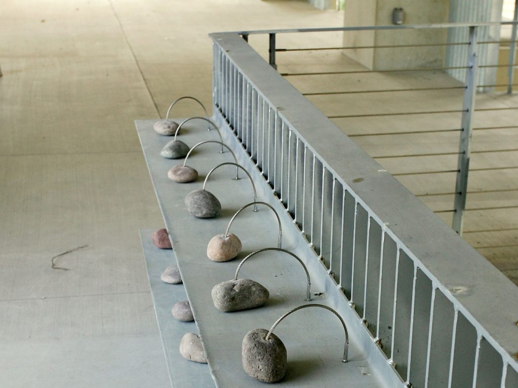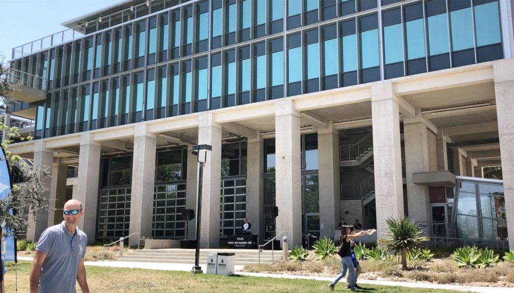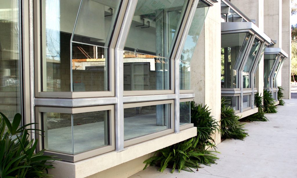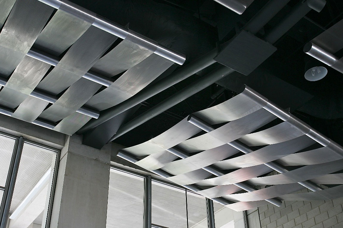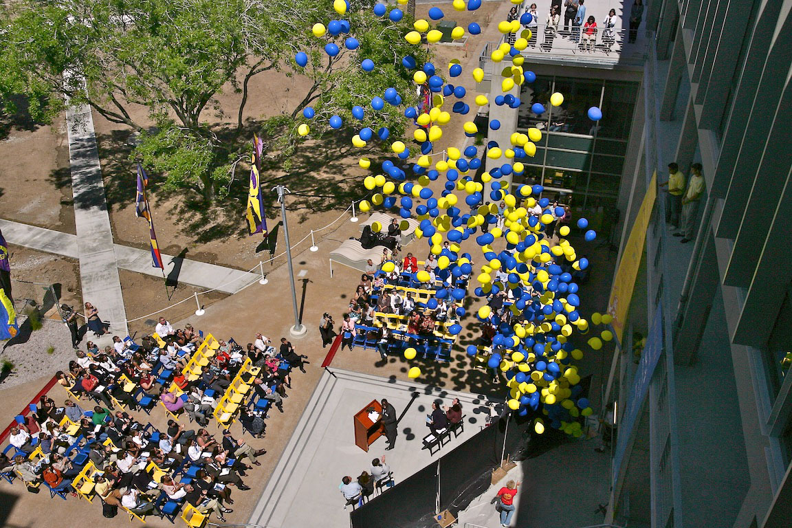 In the crook of the “elbow” where the two wings of the building join, a courtyard serves as a great outdoor lobby. Outdoor walkways on the upper floors link the major departments and include widened areas for spontaneous gathering and conversation, facilitated by the installation of outdoor furniture. Terraces, stairs, and landings overlook the courtyard and invite users to the upper levels. Retail spaces and restaurants further animate the structure. Occupying the ground-level corner of the “L” is the Triton Center where students and visitors receive information, guided tours, and referrals to the various departments in the building.