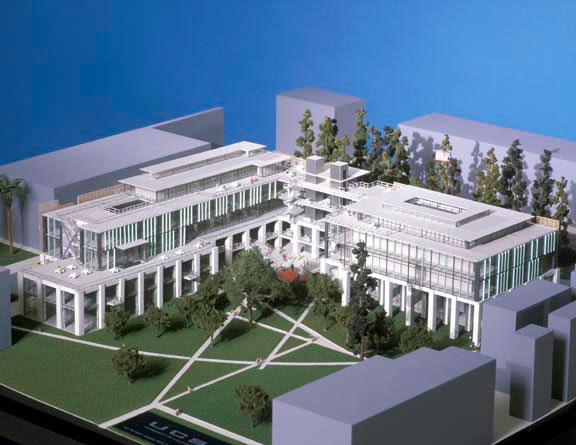 From an urban design point of view, the setting suggested this to be a “background” building—funneling the eye toward the larger, more elaborate student union. At the same time, this building needed to define and connect three separate landscaped quads in this most urban neighborhood of the campus. The “L” shape of the building and its simple, arcaded facades serve to shape the public quads and streets on the south and west sides. A more casual architecture fronts the existing green to the northeast.
