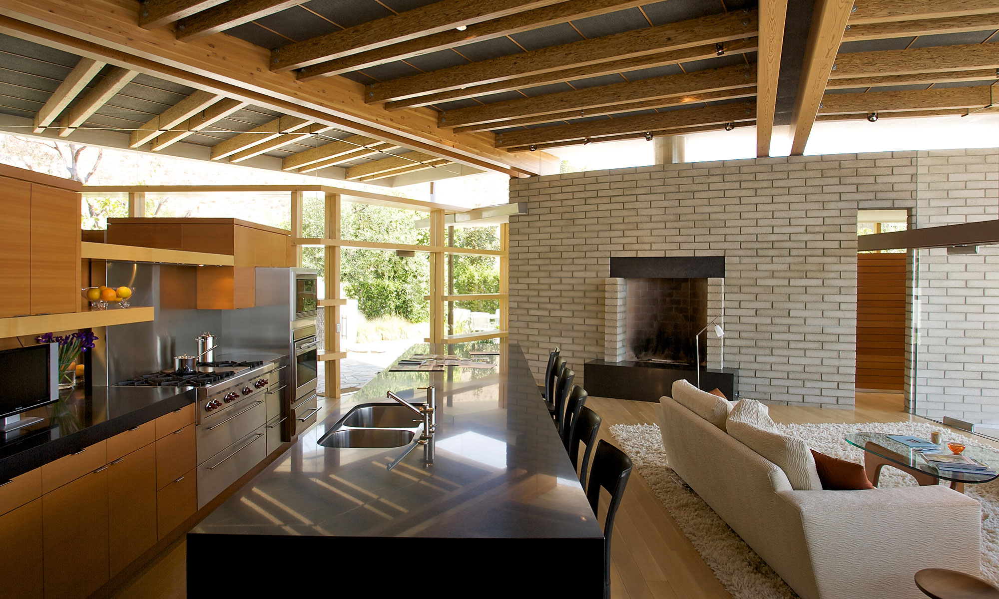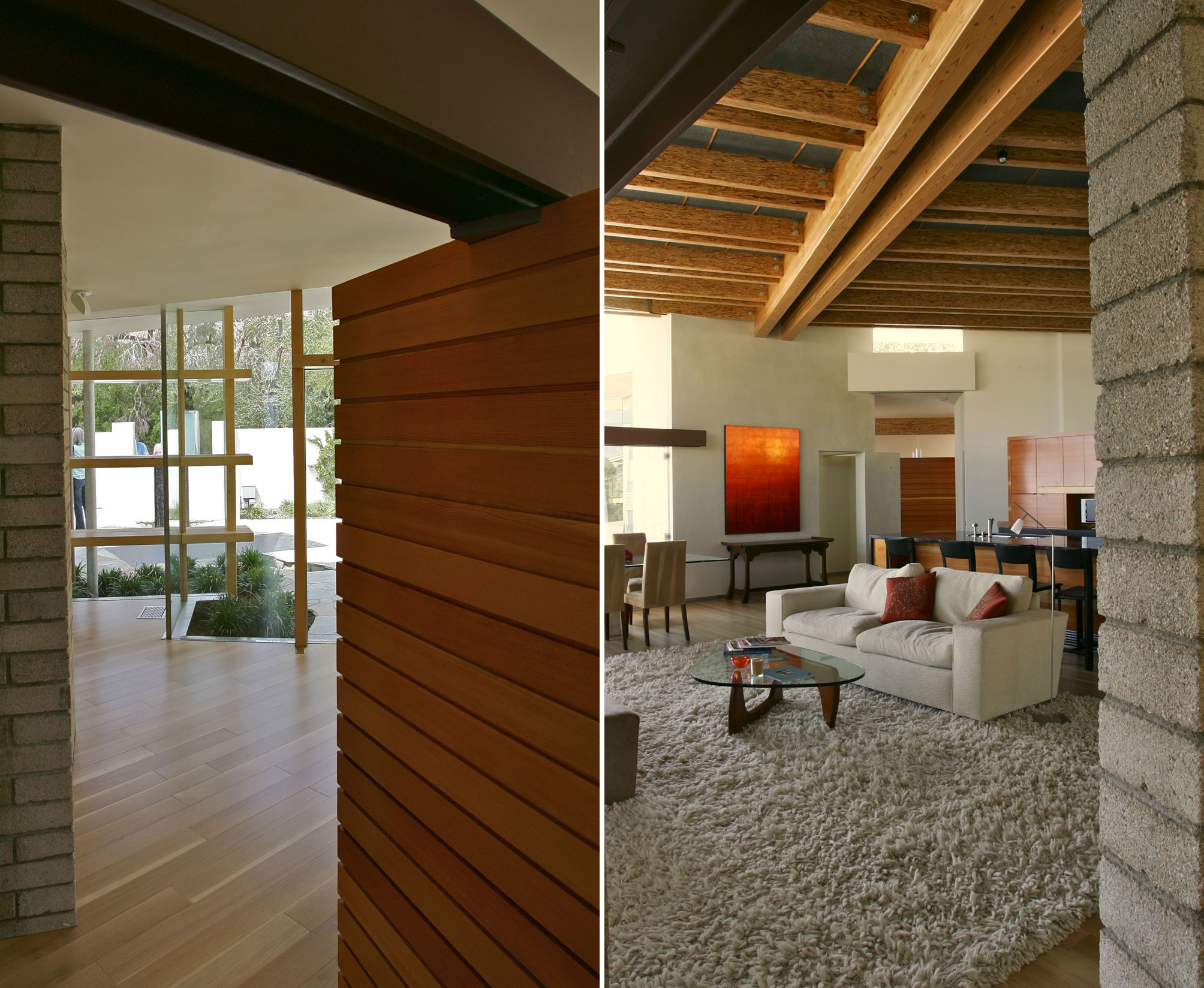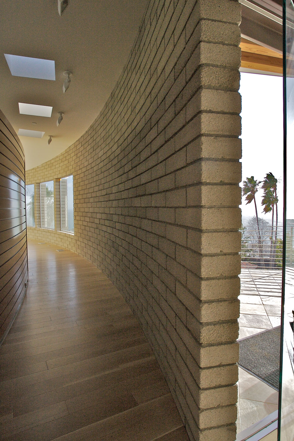 Floating roof panels are anchored by the arc of a softly sandblasted block wall. The wall separates the husband’s study and the wife’s studio from the Great Room. The Great Room is the heart of the house, containing the living, dining, and kitchen areas.