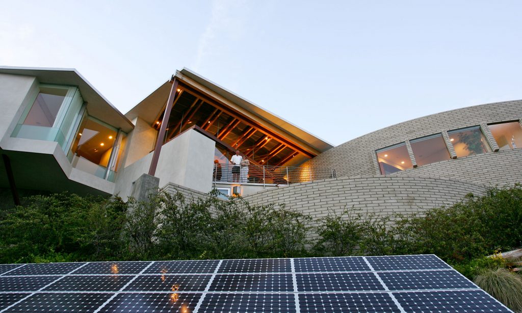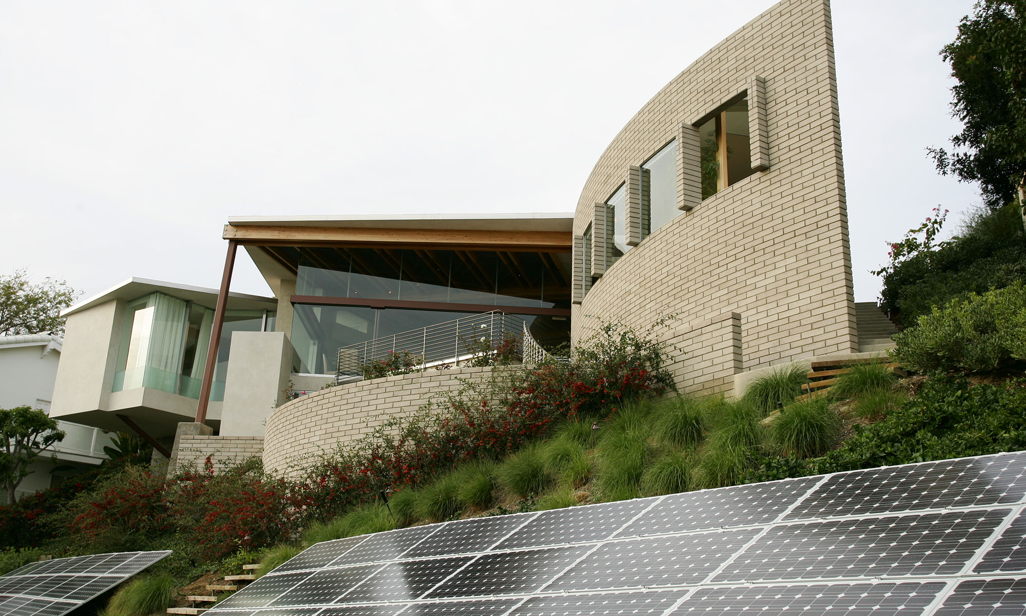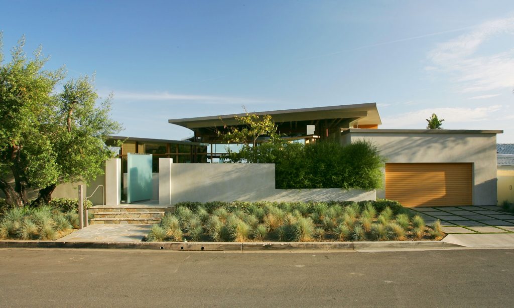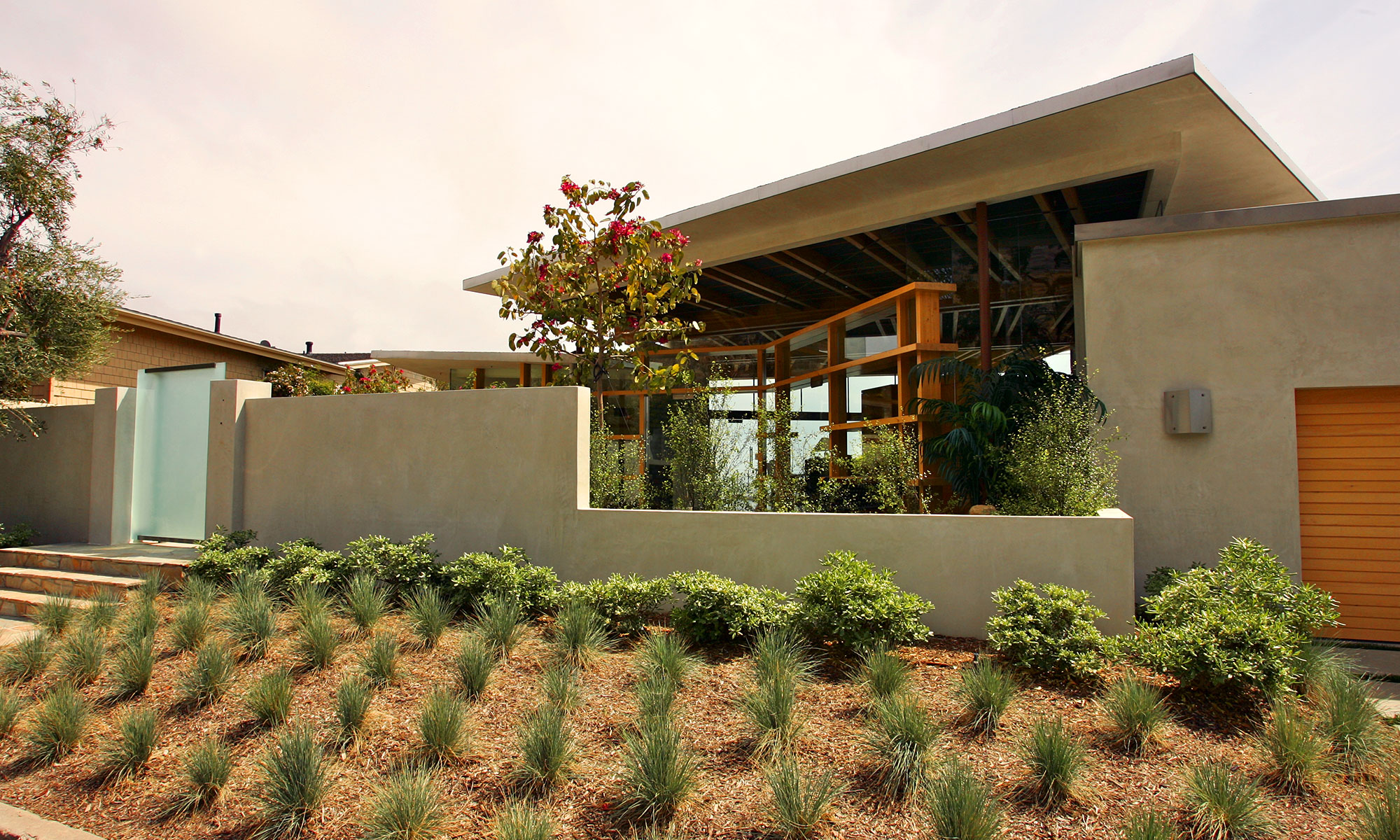 Floating roof panels are anchored by the arc of a softly sandblasted block wall. The wall separates the husband’s study and the wife’s studio from the Great Room. The Great Room is the heart of the house, containing the living, dining, and kitchen areas.