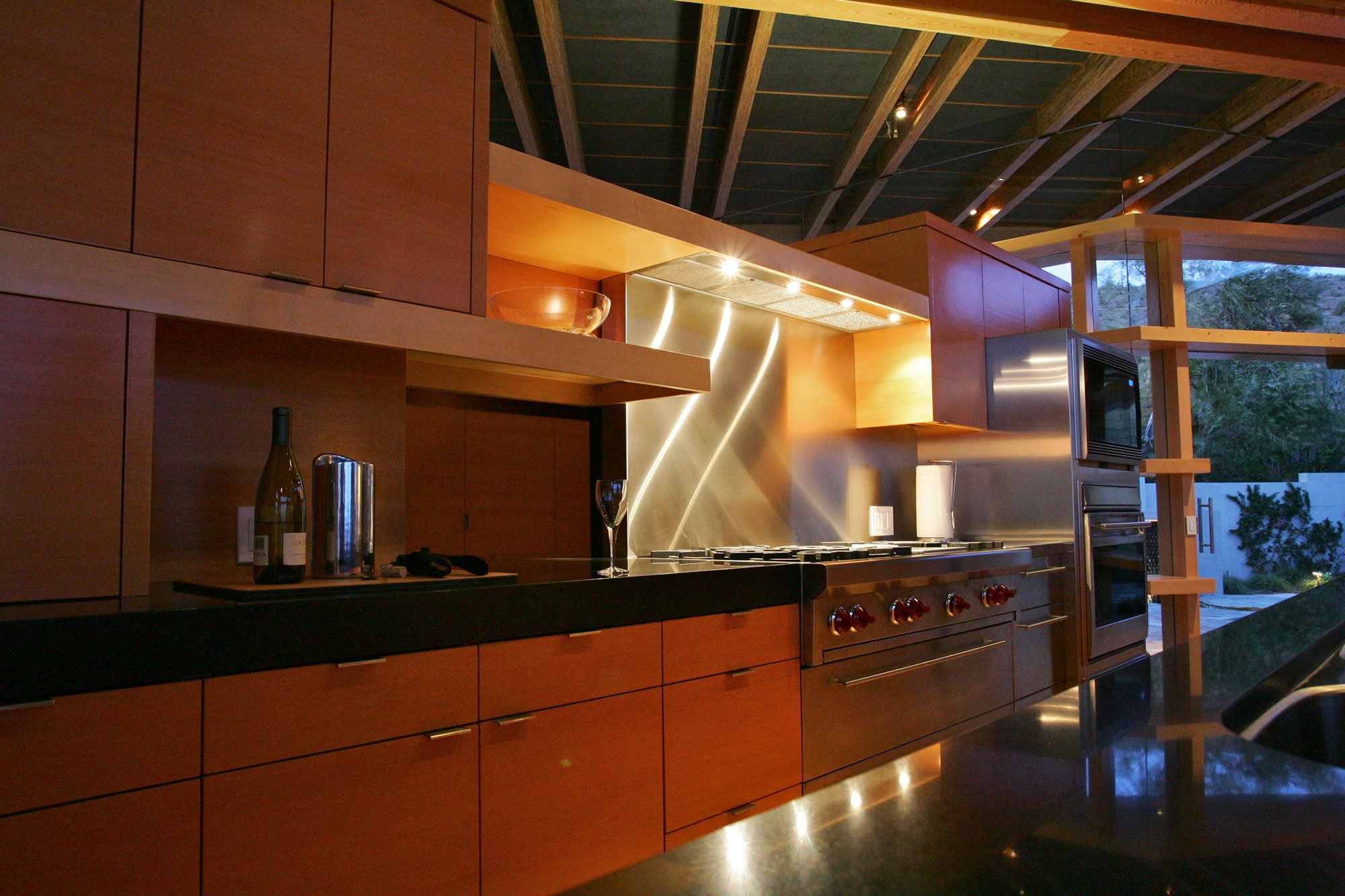 The gourmet kitchen is surprisingly compact on the “working side.” Adjacent to and behind this kitchen is the secret to its efficient footprint: a second area of equal size containing additional cold storage, a second sink and working counter, and a large pantry. This arrangement allows for an appropriately intimate kitchen for two that can support large-scale entertaining when necessary.